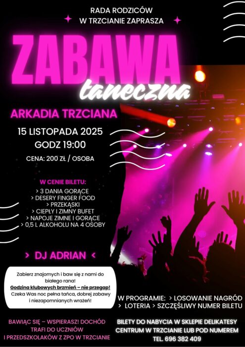 Rada Rodziców przy SP w Trzcianie serdecznie zaprasza wszystkich chętnych parafian na zabawę taneczną, która odbędzie się 15 listopada w sali Arkadia. Dochód z zabawy przeznaczony będzie na potrzeby uczniów i przedszkolaków z Trzciany. Bilety dostępne są u członków Rady Rodziców oraz w sklepie Delikatesy Centrum.