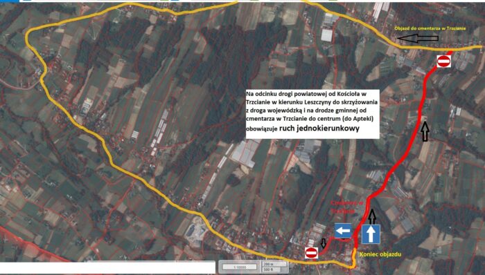 - i drogą gminną od skrzyżowania pod niżej cmentarza, przez Działki do Rynku. Osoby, które zaparkują samochody przy cmentarzu, nie będą mogły zjechać w dół w stronę kościoła, muszą pojechać w stronę Leszczyny i do Trzciany powrócić drogą wojewódzką 966, jadąc w stronę Łapanowa lub drogą gminną przez Srokówkę.